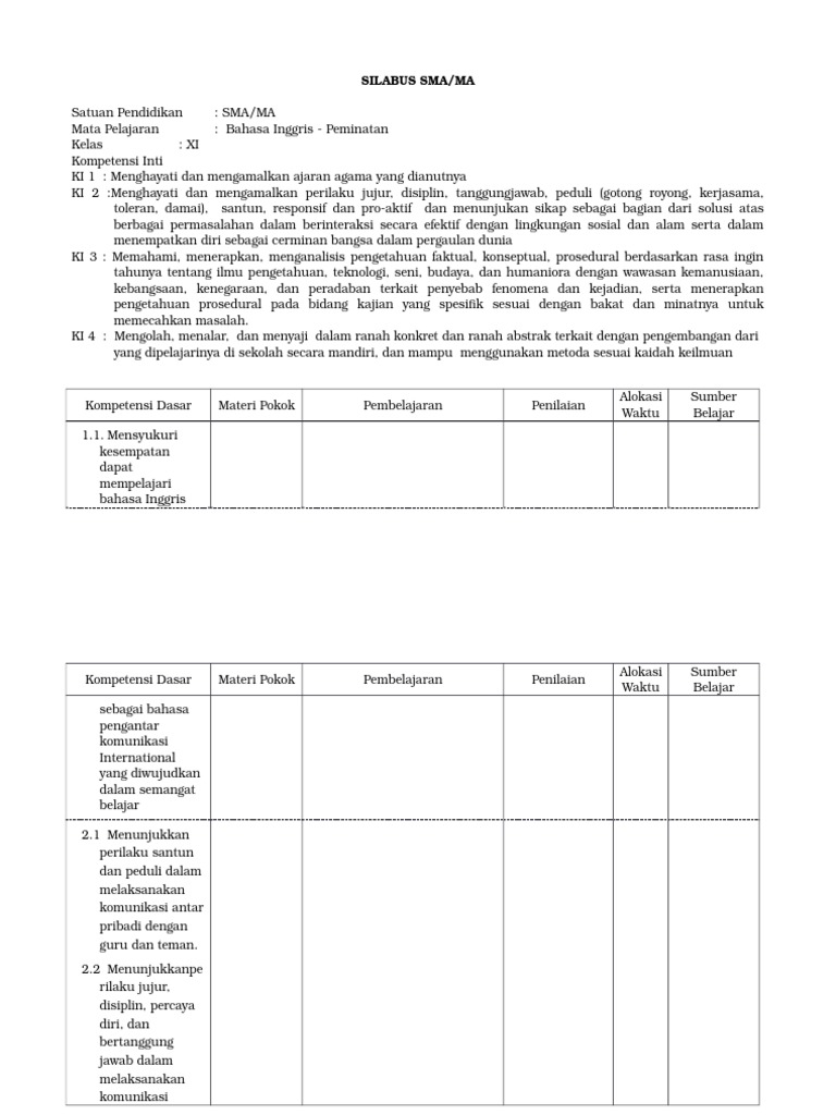 Minta tolong kirimi silabus ski kls x1 x11 dan rpp kls x1 dan x11 makasih sebelum ny…. Diposting oleh abdul ghufron di 05.46. Memahami ketentuan islam tentang siyasah syar'iyah kompetensi dasar materi pembelajaran kegiatan. Silabus produk kreatif dan kewirausahaan kelas xi tahun 2019. Download silabus dan rpp sma silabus bahasa inggris sma kls x_peminatan.